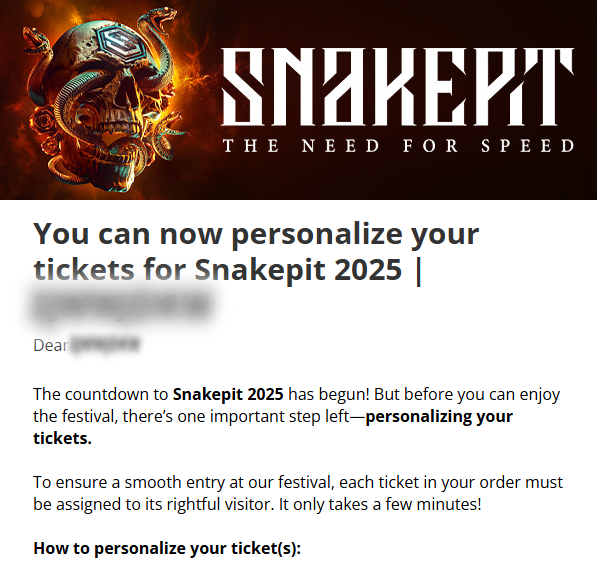 Right after you purchased your tickets, you (the main booker) should have received an email from Snakepit with a request to personalize your tickets. Please look up this email in your inbox (or spam) and click the personalization link.