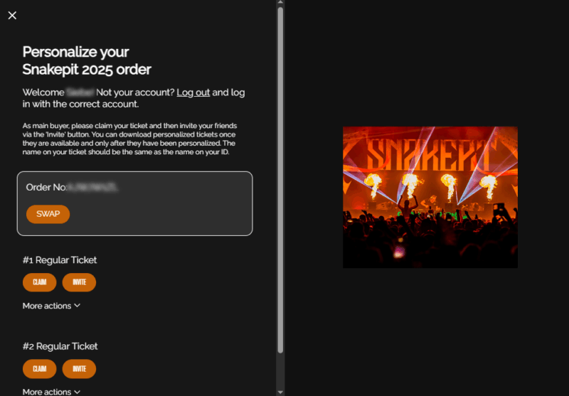 Important: each email address can only be used once, so make sure to use a different account/email address for each ticket! If you bought tickets before (different order number) and claimed tickets from that previous order already, it will also not be possible to use that account(s)/email address(es) again to personalize.